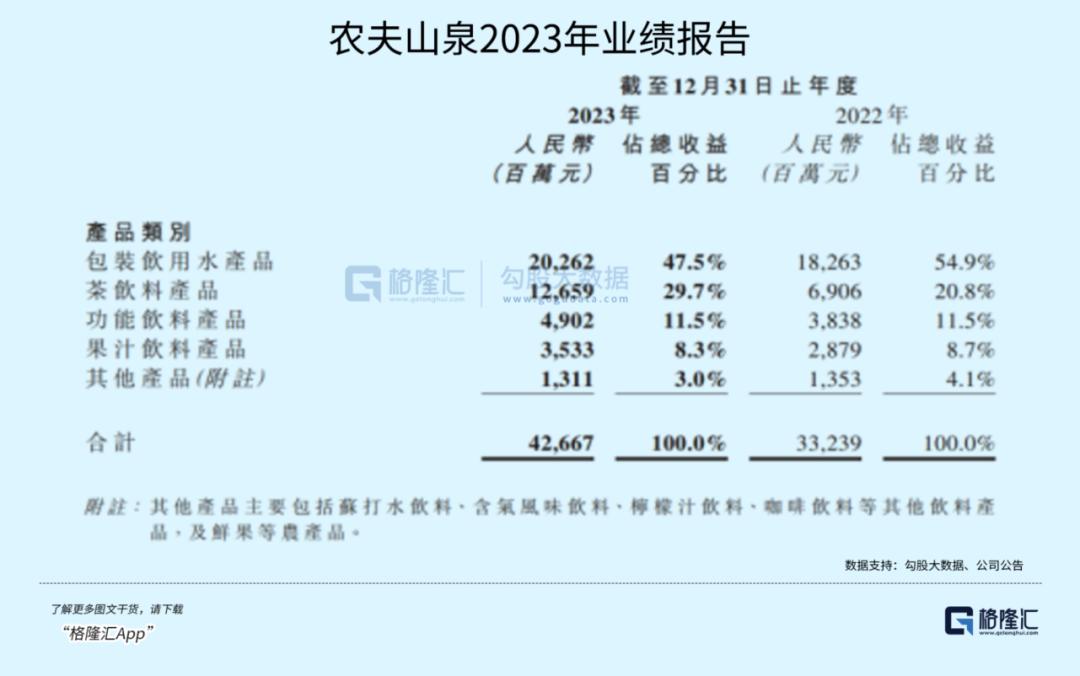 2023年,农夫山泉的茶饮料品类收入126.59亿元,同比增长83.3%,成为了公司第二个营收突破100亿元的品类,占整体营收的比重也同比大增8.9个百分点,达到了总收入的29.7%。
