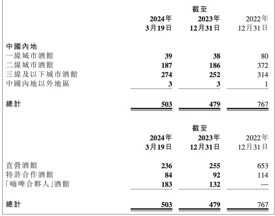 海伦司同样在财报中指出,截至2024年3月19日,海伦司直营、特许加盟门店仍在持续闭店,但“嗨啤合伙人”酒馆加盟快速增加,公司总门店规模回升至503家。尤其是公司对于国内低线城市、下沉市场的大举布局,成为其门店规模增长的主要动力。