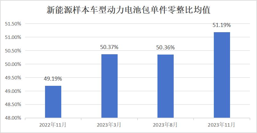 动力电池“脱保”,最主要的矛盾点就是价格问题。3月22日,中保研发布的最新汽车零整比体系指标研究成果显示,50款新能源样本车型动力电池包单件零整比均值为51.19%,较上期指标上涨4.79%。