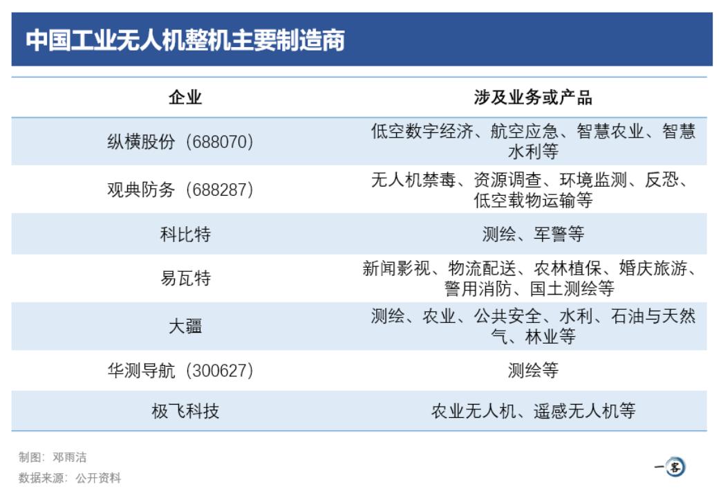 在工业无人机领域,已经有一批上市公司涌现,如纵横股份(688070)、观典防务(688287)、华测导航(300627),大疆这类主营消费无人机的公司,也将场景扩展至工业级。