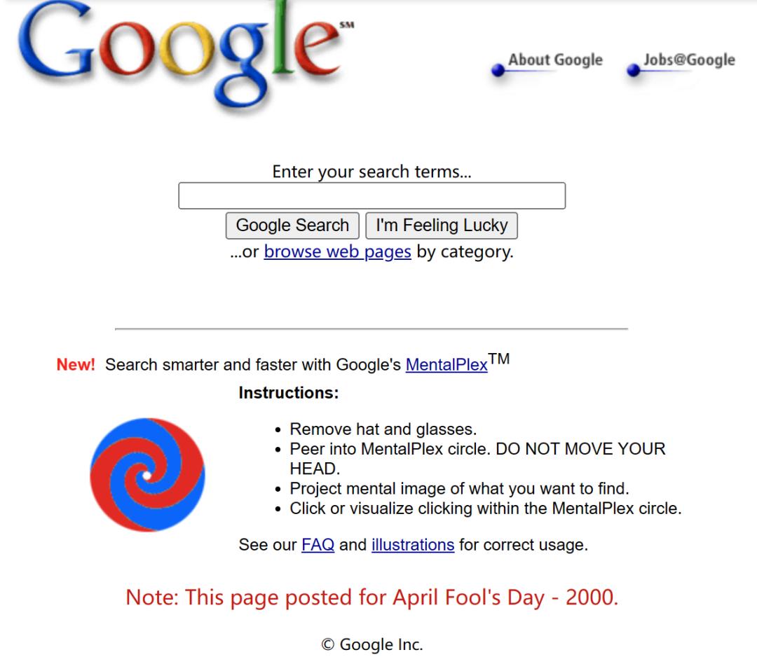 2000 年,谷歌的第一个愚人节玩笑名为意念搜索(MentalPlex),声称可以猜测用户的心思:用户只需盯着屏幕上的一个漩涡 GIF 图,心里想着要搜索的内容,点击漩涡即可完成搜索。(MentalPlex 现在仍能访问,地址:https://archive.google/mentalplex/)