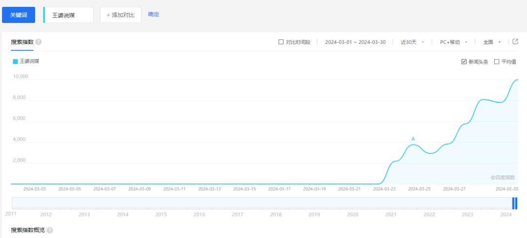 3月23日开始,王婆说媒百度指数一路上扬,从2182,一路飙升到3月30日的9975,且呈现继续飘红的强劲势头。