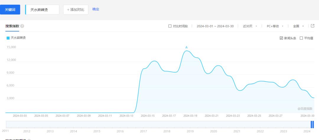 百度指数显示,从2024年3月13日开始,天水麻辣烫的百度搜索指数和资讯指数开始上升,3月18日,天水麻辣烫搜索指数达到峰值,为14554,随后搜索及资讯指数均开始下降,到3月30日搜索指数已经跌落至3492。