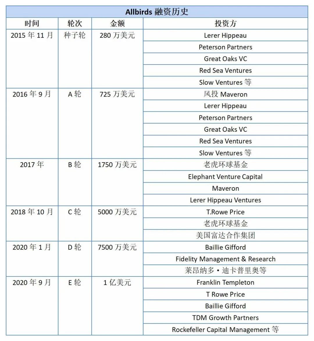 Allbirds在IPO之前,完成了6轮、累计超2亿美元的融资。