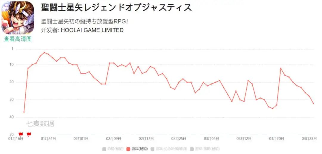 去年,互爱互动的海外收入实现较大增长,从2019年占公司总游戏收入的8%,在2023年提升至30%。不仅如此,开年公司还在海外收获了一个IP小爆款。其于2024年1月18日在日本市场推出了放置RPG《圣斗士星矢:正义传说》,该产品上线后迅速攀升至iOS、Google Play畅销榜前三,截至目前基本稳居双端畅销榜TOP30。