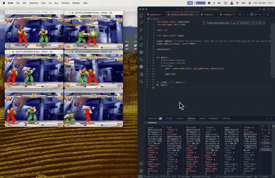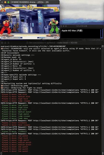 每个大模型控制一个游戏角色,程序向大模型发送屏幕画面的文本描述,大模型根据双方血量、怒气值、位置、上一个动作、对手的上一个动作等信息做出最优决策。
