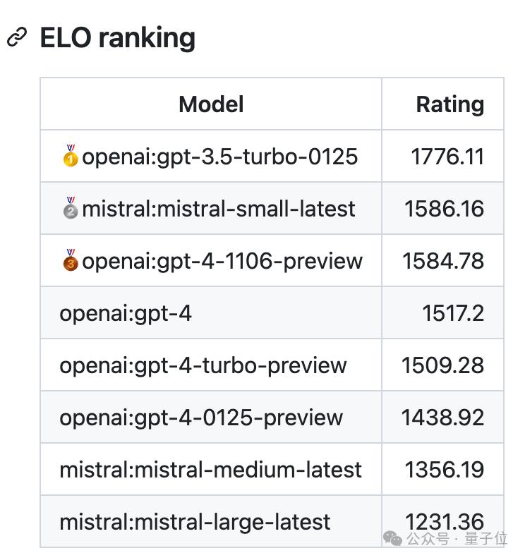 最新版gpt-3.5-turbo成绩断崖式领先,Mistral小杯排第二。更小的模型超过了更大的如GPT-4和Mistral中杯大杯。