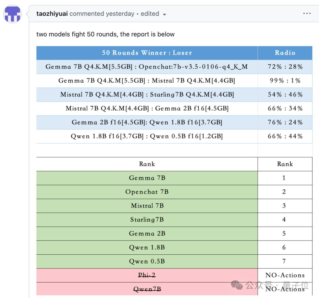 后续也有用户提交了流行开源模型的对战结果,在7B及以下量级的战斗中,还是7B模型排名更靠前。