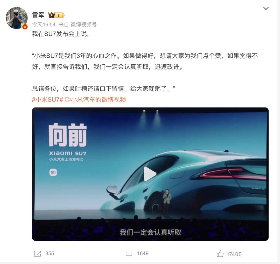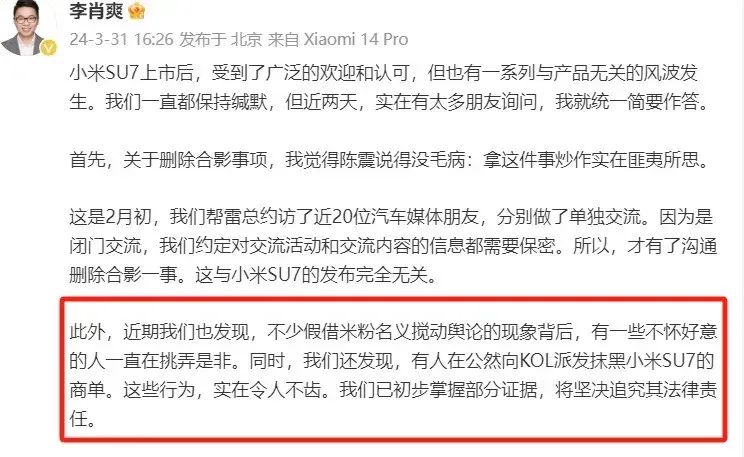 显然,雷军和小米汽车已经做好了战斗准备。一方面,小米汽车的公关、法务做出强硬回应。比如,3月31日,小米汽车副总裁李肖爽发文称,不少假借米粉名义搅动舆论的现象背后,有一些不怀好意的人一直在挑弄是非。同时,我们还发现,有人在公然向KOL派发抹黑小米SU7的商单。这些行为,实在令人不齿。我们已初步掌握部分证据,将坚决追究其法律责任。
