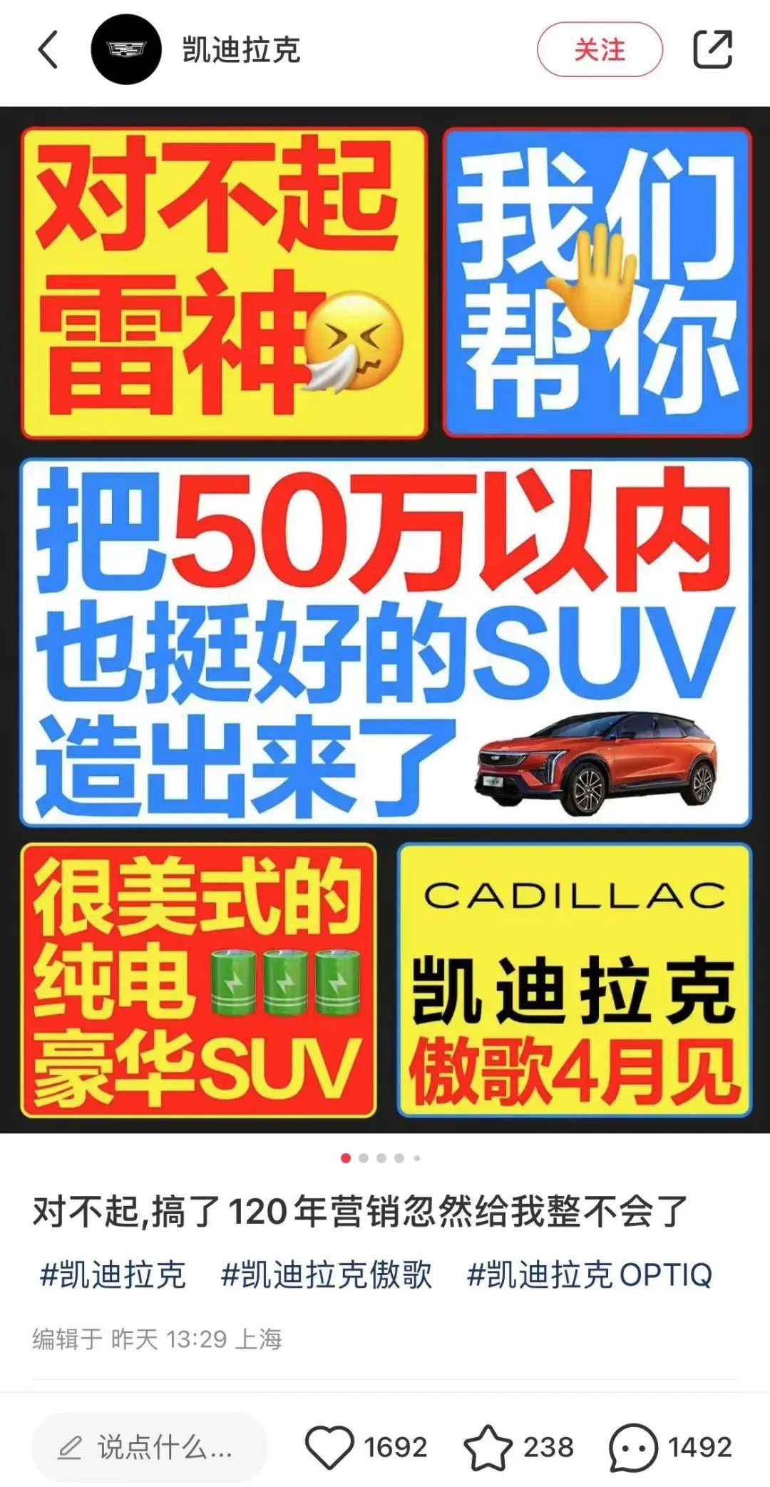 还有媒体提到,凯迪拉克官方小红书账号发文预热新车“傲歌”,连发多张“椰树椰汁”风格的海报,标题为“对不起,搞了120年营销忽然给我整不会了”。
