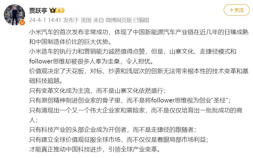 这句话是贾跃亭给业界诠释的。4月1日愚人节这天,他在遥远的大洋彼岸公开点评小米汽车。这突然而来的“关心”,迅速登上了微博热搜,引发业界和网友的热议。