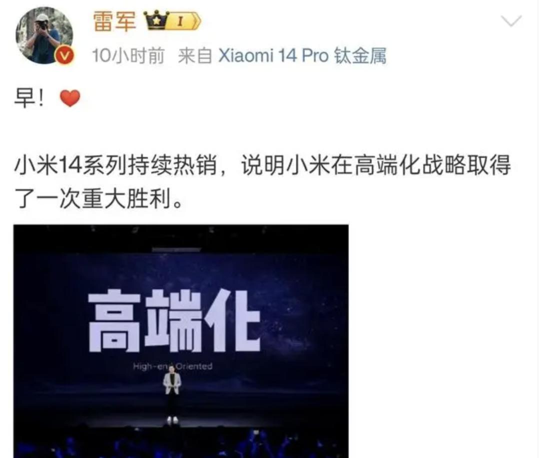 目前来看,雷军对小米高端化战略的成绩是满意的。小米14系列热销时,他兴奋地在微博表示,小米在高端化战略取得了一次重大胜利!