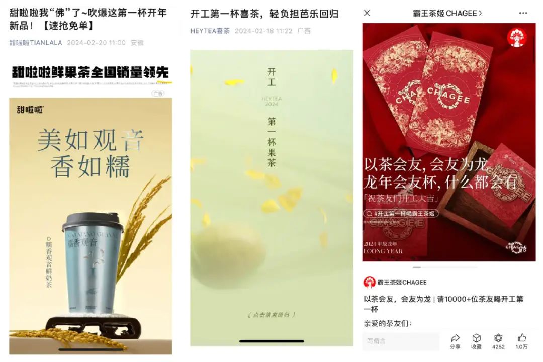 在开工求好运的巨大消费热情之下,除了喜茶之外,霸王茶姬、奈雪的茶、甜啦啦等一众奶茶品牌也开启了一波又一波的开工新品上新,且都主打好运新品,助打工人们收获新年吉祥运势,算是打响了开年玄学营销第一枪。