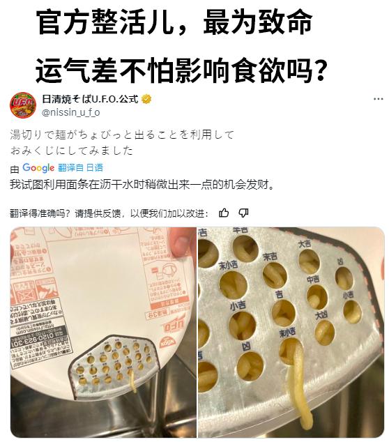 比如,除了前文提到的奶茶木鱼周边、民俗玄学圣杯等等,连泡面盒都可以成为玄学小道具。今年1月25日,日清拉面推出了一款可以一边泡面一边抽签的“占卜泡面盒”,在21个漏水口都标注了凶吉,滤水时拉面从哪个出水口跑出来,其对应的字样就是占卜结果。