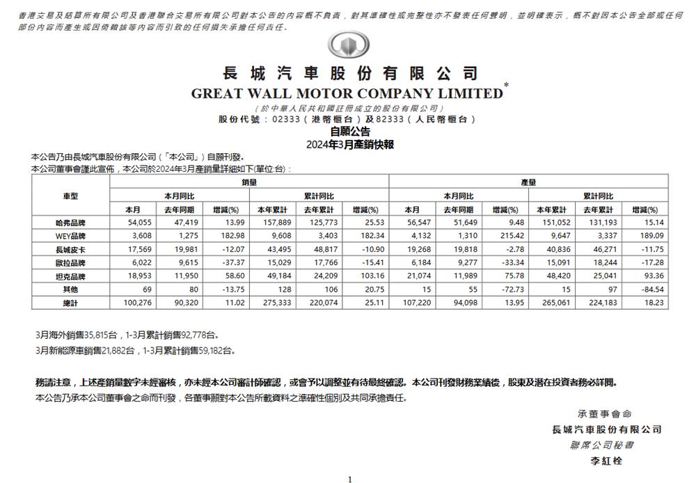长城汽车3月新能源车销售2.2万辆,环比增长78%,同比增长66%。