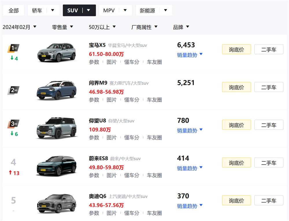 2月50万元以上SUV销量排行TOP5(图源懂车帝)