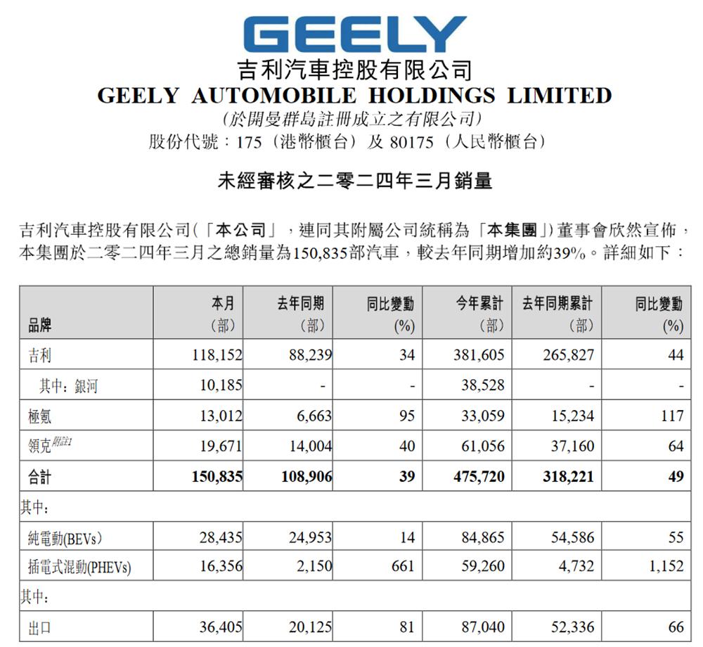 吉利新能源汽车也实现同环比双增,3月销量15万辆,新能源汽车占据4.5万辆,环比增长34%,同比增长65%,新能源渗透率约30%。