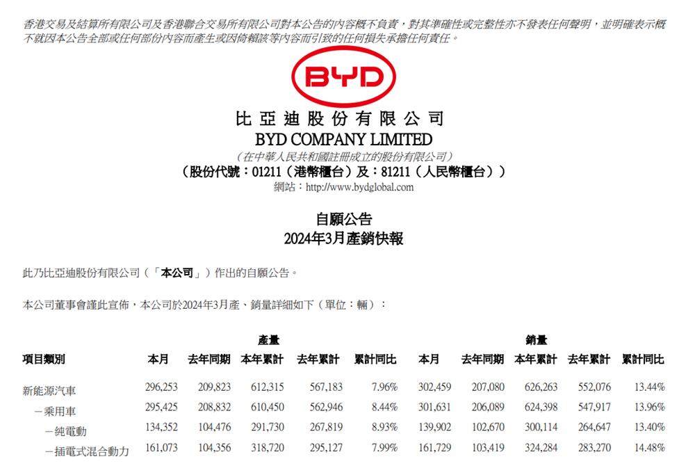 根据官方发布的2024年3月产销快报,3月比亚迪销售汽车30.2万辆,直接比2月多卖出18万辆新能源,环比增长148%。而去年同期卖车20.7万辆,3月同比增长46%。