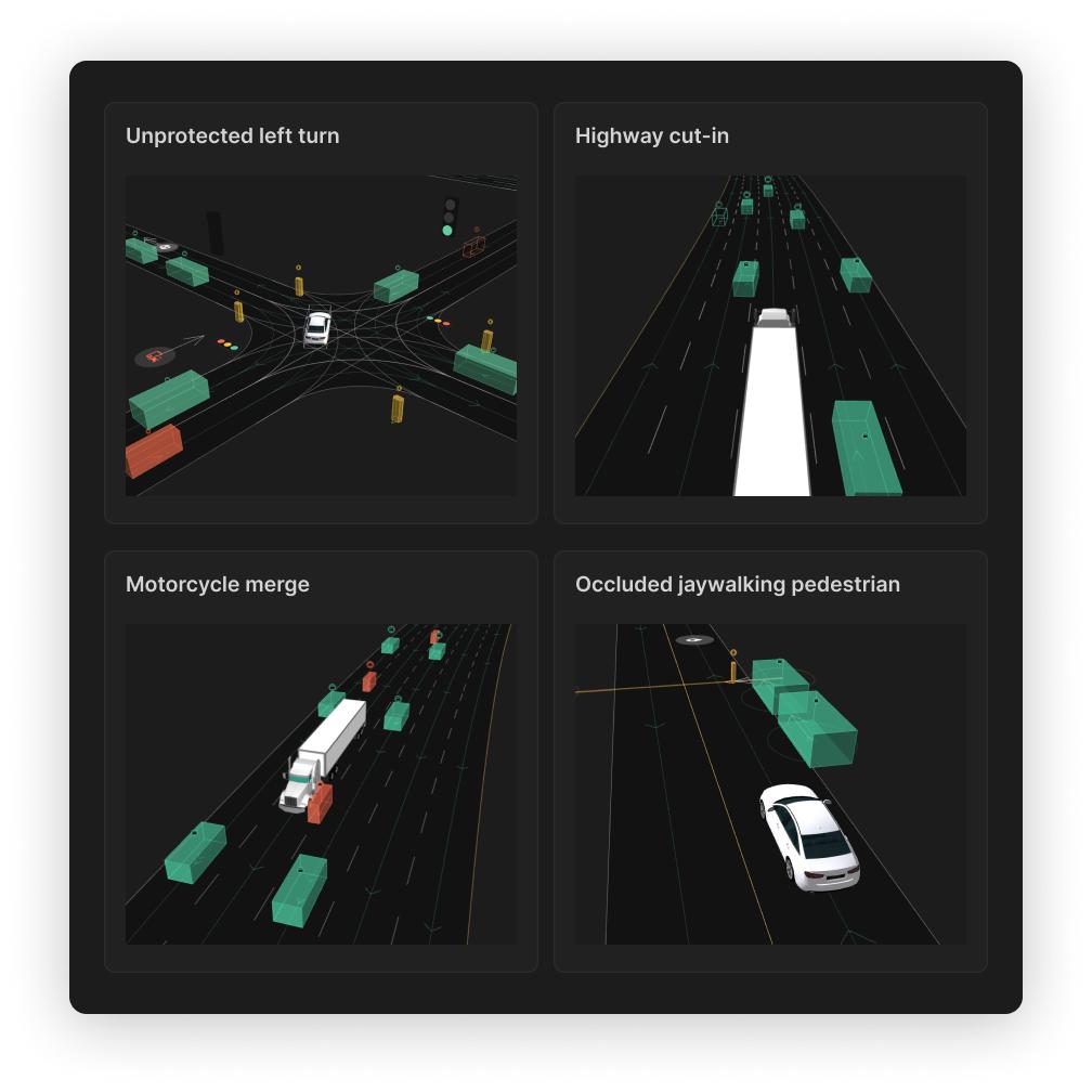 通过重新模拟真实世界的驾驶日志来补充合成场景,并使用 AI 生成技术创建手工难以创建的复杂场景|来源:Applied Intuition 官网