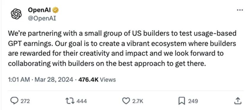 OpenAI也在3月底宣布,正与一小部分美国开发者合作,测试基于其GPT使用量进行收费。至此,一些开发者已收到专门邀请,GPT“货币化”步入正轨。