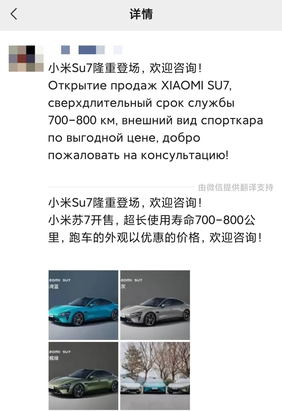 在小米汽车3月28日上市发布会后,吴经理第一时间在朋友圈用两种语言发布了小米汽车的广告。3月29日,吴经理向时代财经透露,已经有两位俄罗斯客户表示感兴趣:“他们的评价是车很漂亮,算上运到中国口岸的成本价格也合适。打算观望一下再下单。”