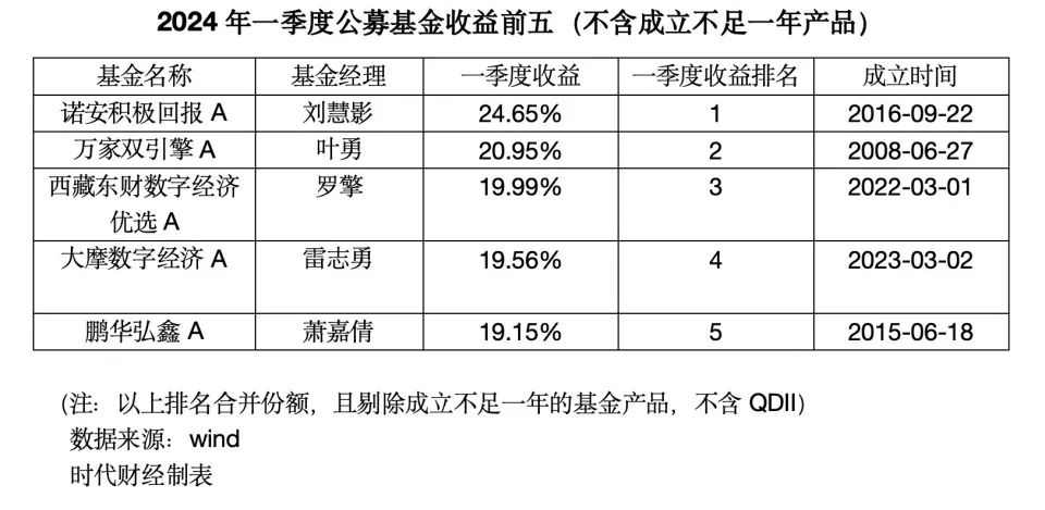2024年一季度,Sora引领的AI热潮及黄金价格不断走高推高了相关基金的净值,收益靠前的基金产品中,多数布局这两个重点板块。