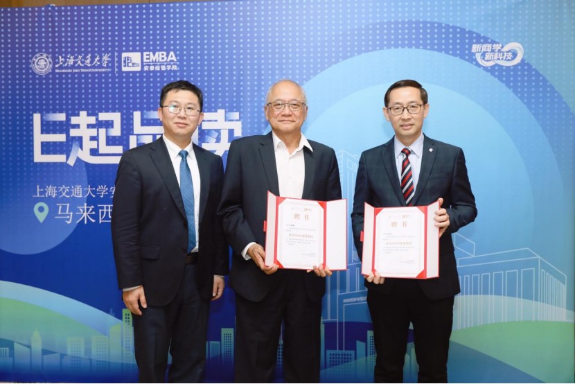 活动现场,上海交大安泰经管学院副院长尹海涛为马来西亚美的苏英电子有限公司及东芝马来销售公司名誉董事长、兼任亚太区域高级战略顾问黄光震先生和马来西亚中华总商会总财政拿督孔令龙先生颁发交大安泰亚太EMBA客座教授聘书。