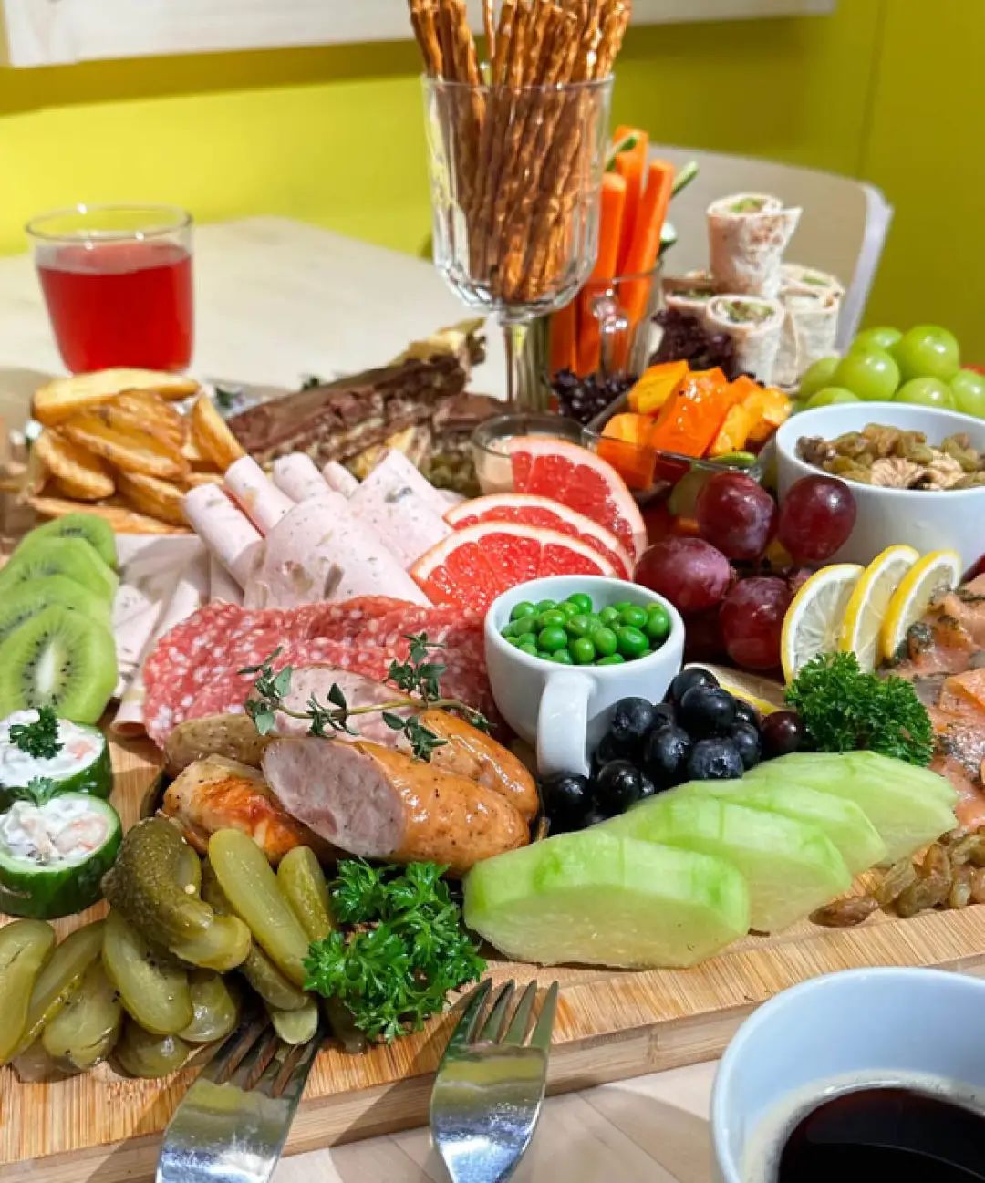 点饭的全程都像极了大学食堂,主打一个自助。最开始拿上餐盘,然后以果汁、甜品、沙拉、主食和炸品的顺序完成取餐,想吃什么你自己从已经放好的餐柜上拿。有点像吃港式早茶,只不过一个是端到你面前,一个是你自己去拿餐。