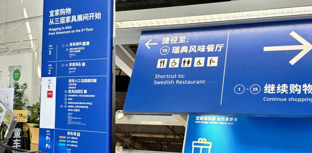 带着这样的疑惑,我们走进宜家,发现虽然北欧人以冷淡出名,但宜家做起疯五还是挺热辣的。一进门的墙壁、电梯、海报上都是对自家“瑞典风味餐厅”的宣传。因为餐厅在顶楼(三楼),所以可以一楼一楼地慢慢逛上去,也可以坐直达电梯。