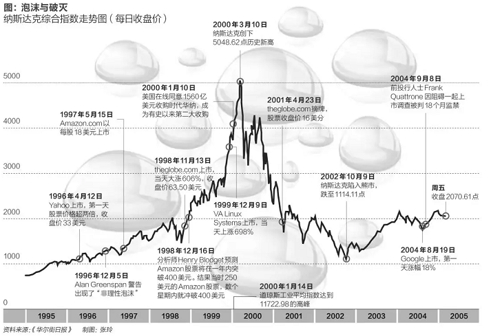 伴随着这种疯狂,在股票市场上,代表科技公司的纳斯达克指数,从1995年初的700多点,一路上涨到2000年3月10日的峰值5132点。