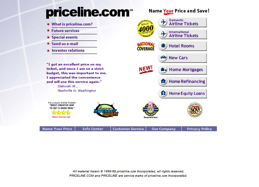1999 年 3 月,一家靠网站出售机票的公司Priceline 以每股 16 美元的价格上市, 首日交易价格上涨至 88 美元,随后收于 69 美元。这使得 Priceline 的市值达到 98 亿美元。