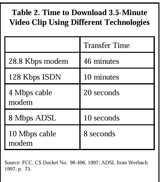 1997年,全美家庭流行的是28.8kb每秒的光猫,想要下载一个3.5分钟的视频(90年代的清晰度),需要花费46分钟。