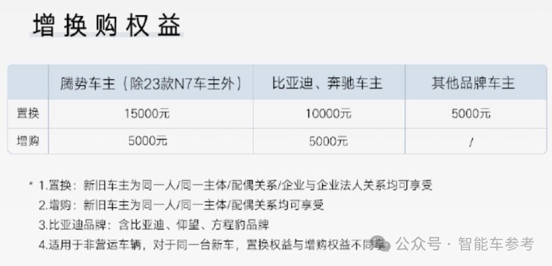 并且在此次2024款上市时,官方也推出了各种优惠,比如定金2000元可抵尾款1万元,N7老车主置换还能享受5万元补贴,给比亚迪、甚至奔驰车主还推出置换补贴。