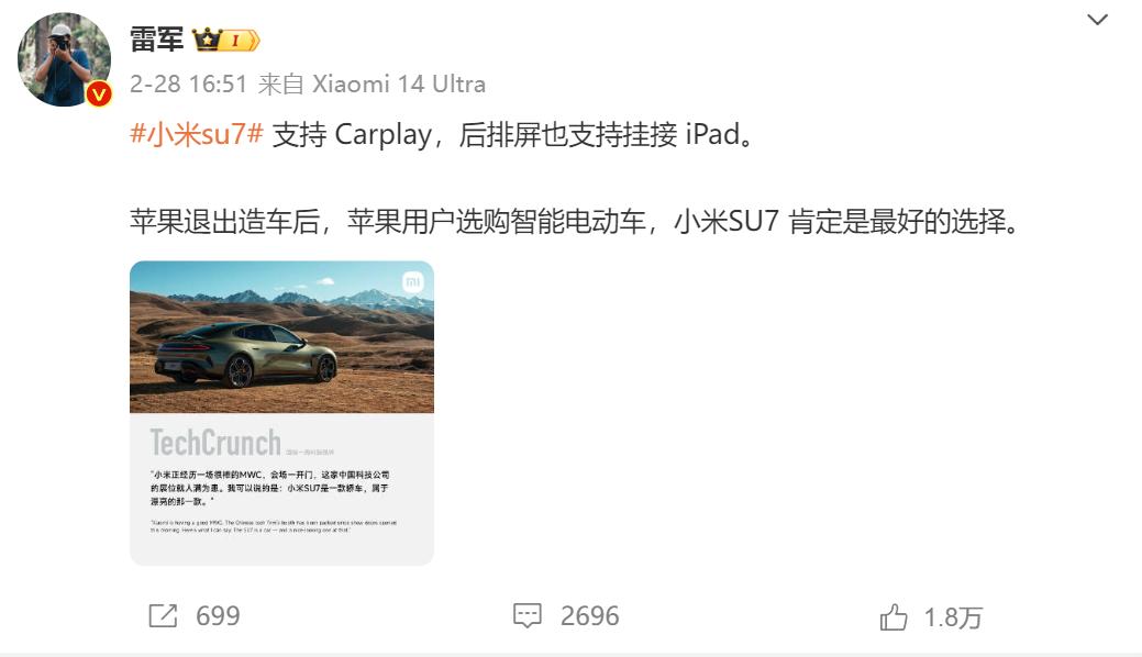 而当多年对标的苹果放弃造车时,小米还可以第一时间站出来宣布兼容,要给苹果用户一个先进的人车家生态体验。