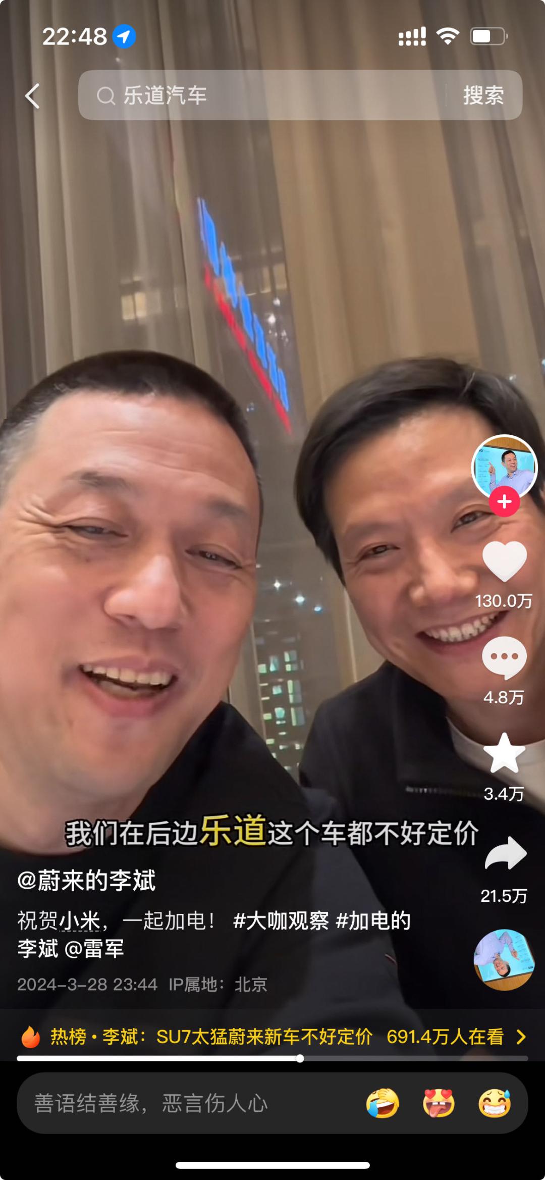 只不过SU7的价格出来之后,台下的何小鹏和李斌脸色似乎有些难看,因为P7和ET5都是其直接竞争对手,这也难怪在发布会后,李斌和雷军说:“SU7定价太猛,让乐道都不好定价了。”