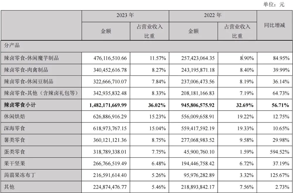 年报显示,盐津铺子的零食产品包括七大品类:辣卤零食、薯类零食、深海零食、休闲烘焙、蛋类零食、蒟蒻果冻布丁、果干坚果等。辣卤零食依然是优势品类,以14.82亿元的营收金额高居榜首,在总营收中占比达到36.02%,同比增长了56.71%。蛋类零食的营收金额虽然仅3.19亿元,占总营收比例7.75%,同比增长却达到了594.52%;蒟蒻果冻布丁营收为2.16亿元,以125.67%的同比增长位列第二。