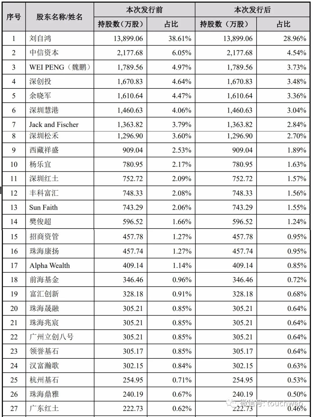 IPO前,中信资本持股为6.05%,WEIPENG(魏鹏)持股为4.97%,深创投持股为4.64%,余晓军持股为4.47%;