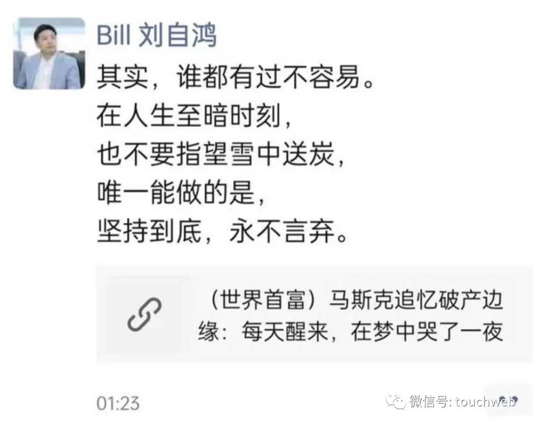 事情也侧面得到了公司创始人、董事长兼CEO刘自鸿的证实。刘自鸿2021年12月9日凌晨,在个人社交媒体上引述《马斯克追忆破产边缘:每天醒来,在梦中哭了一夜》,并发文表示:其实,谁都有过不容易。在人生至暗时刻,也不要指望雪中送炭,唯一能做的是,坚持到底,永不言弃。