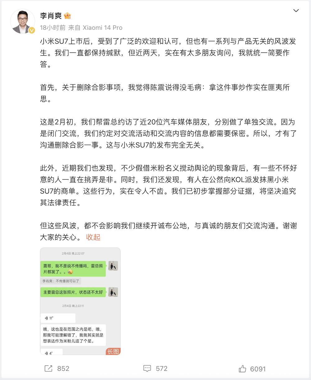 小米汽车副总裁李肖爽近日在微博提到,他们发现近期有个别人士假冒小米粉丝的身份在社交平台上制造不实舆论,其行为似乎旨在挑起争议。此外,还有报告显示,某些人向关键意见领袖(KOL)发送有意诋毁小米SU7的商单。