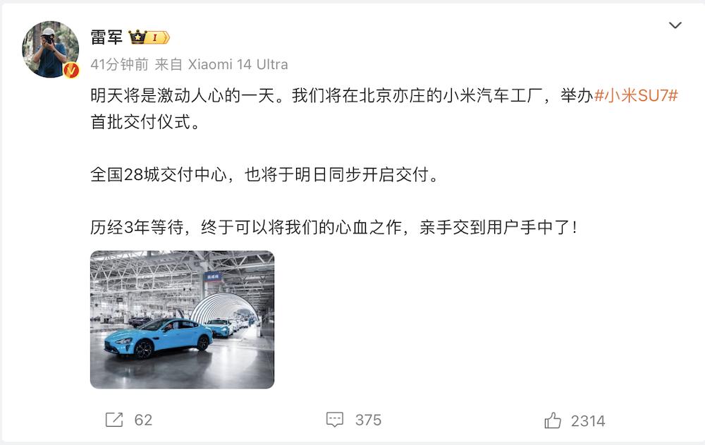 与此同时,小米SU7也即将迎来发布后的第一个重要节点——首批车的正式交付。