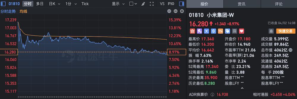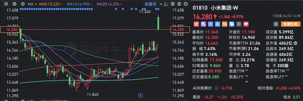 值得注意的是,今天是港股复活节休盘后的首个交易日,也是继3月28日小米汽车发布后的首个交易日。小米汽车港股开盘跳涨16%充分证明了市场对于小米目前的热情。