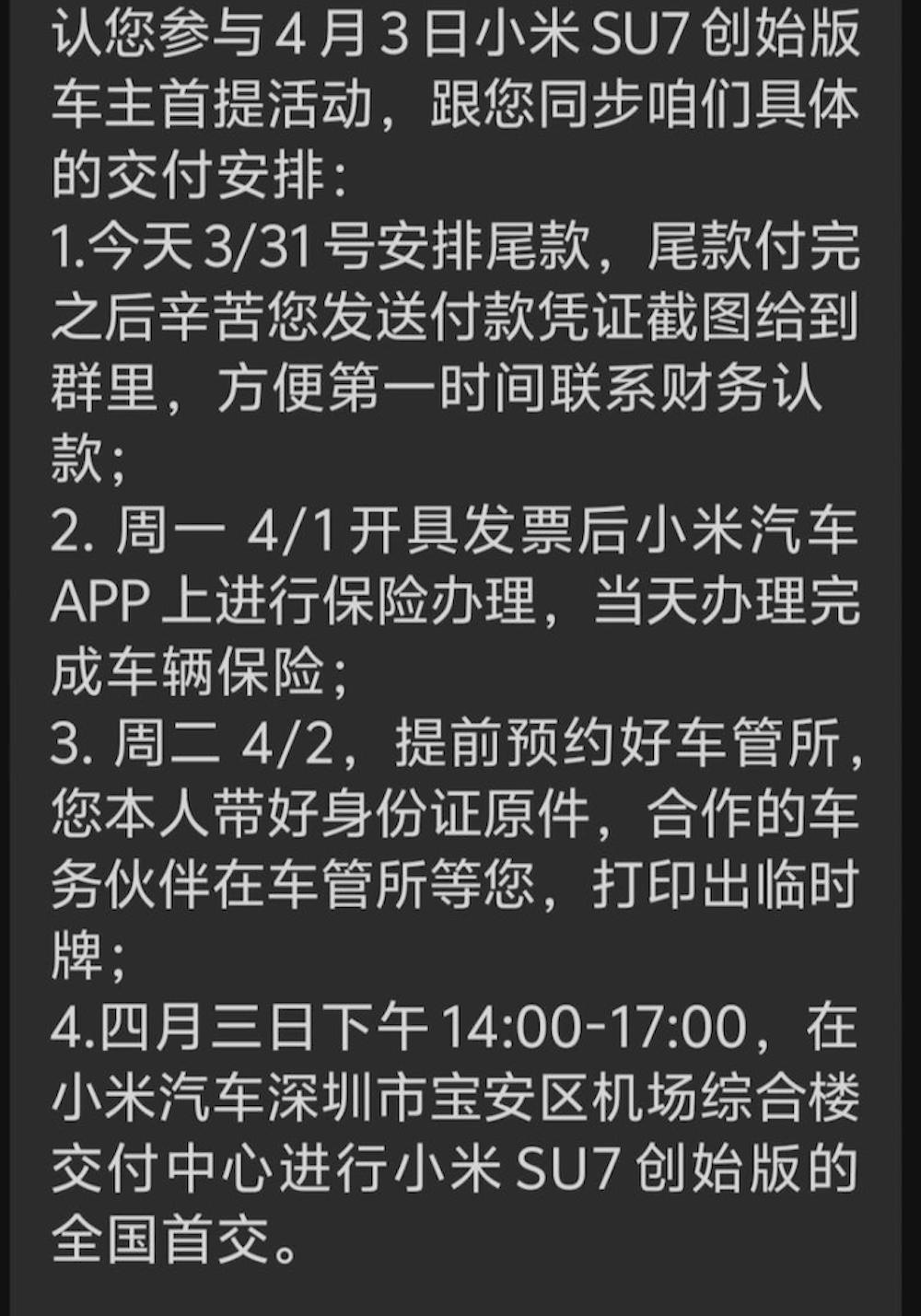 随着小米汽车“发布即交付,交付即上量”的承诺,购买到首批小米SU7创始版的客户将在明天开始交付。