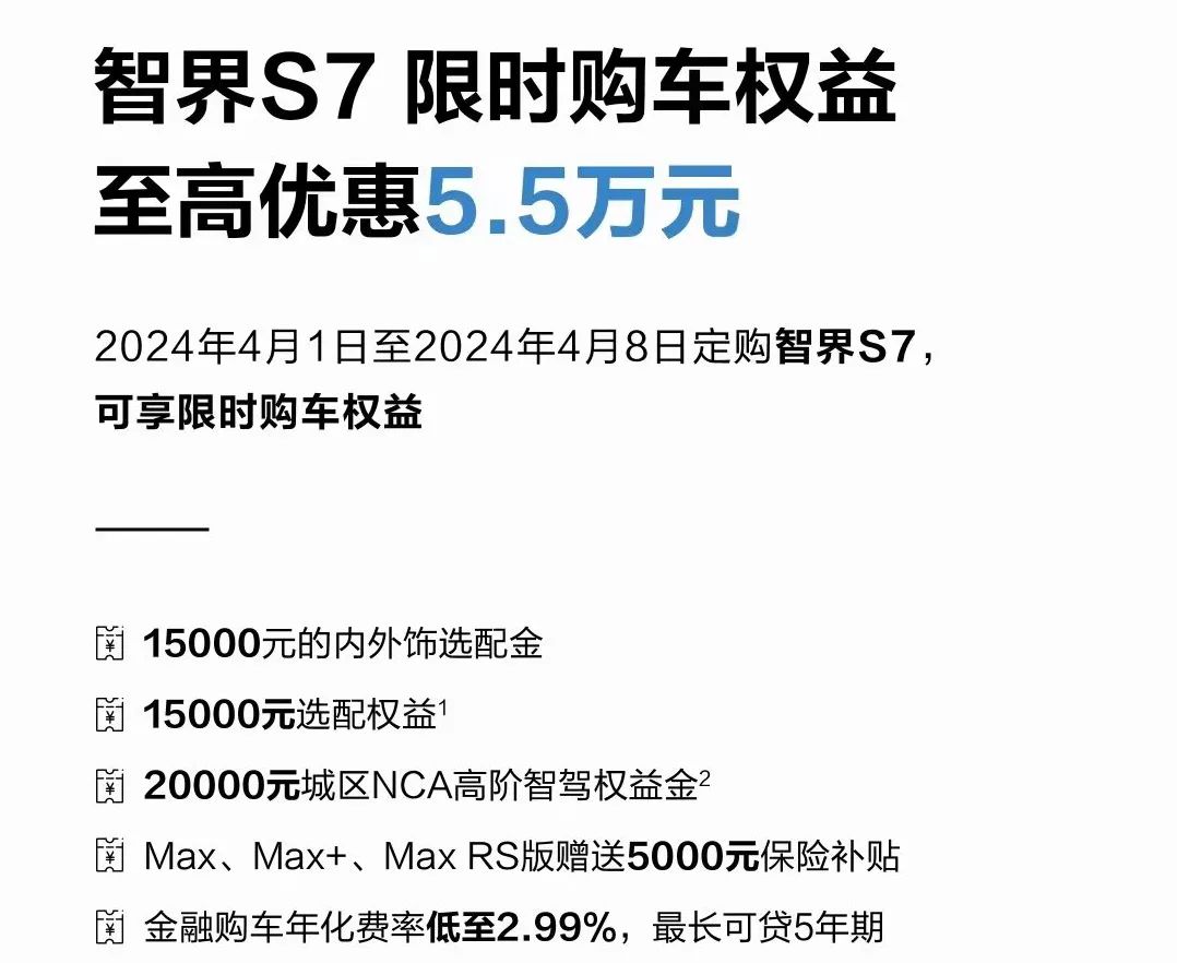 此外,智界S7也在再次发布前开启新一轮盲定,不同车型提供了3万-5.5万元的购置补贴。