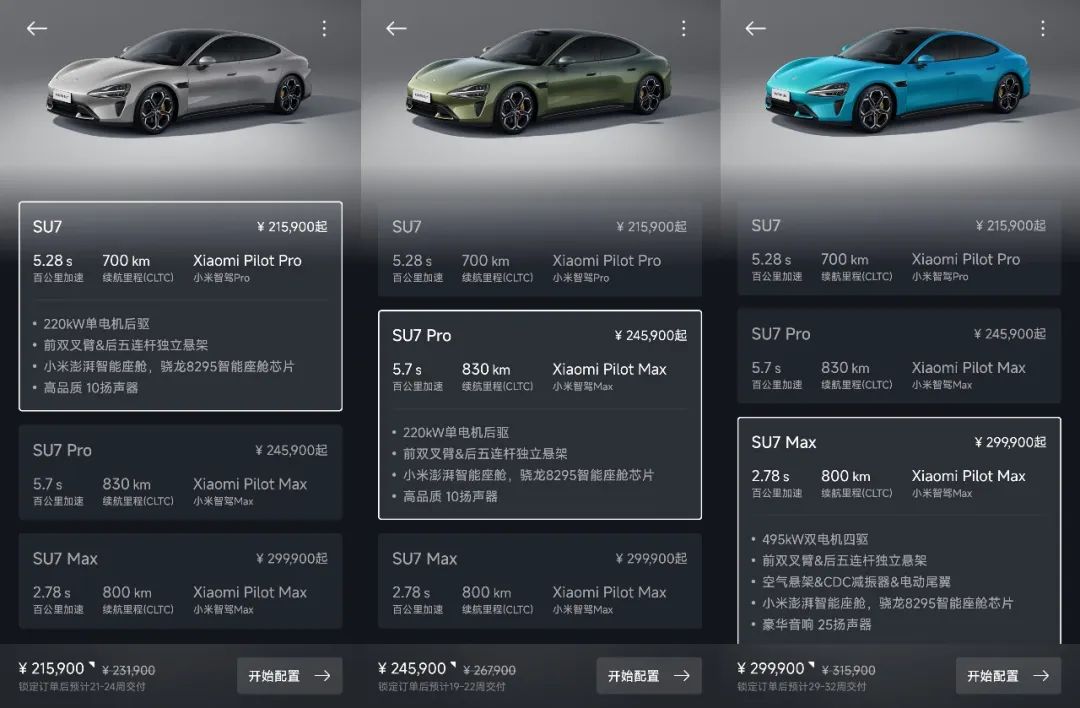 同时据小米汽车APP和部分销售介绍,目前锁单并排产小米SU7 Max的交付日期已经显示到29-32周后,按照目前从四月底开始交付新车的交付节奏来计算,现在订车,提车时间很可能会排到今年年底前后。