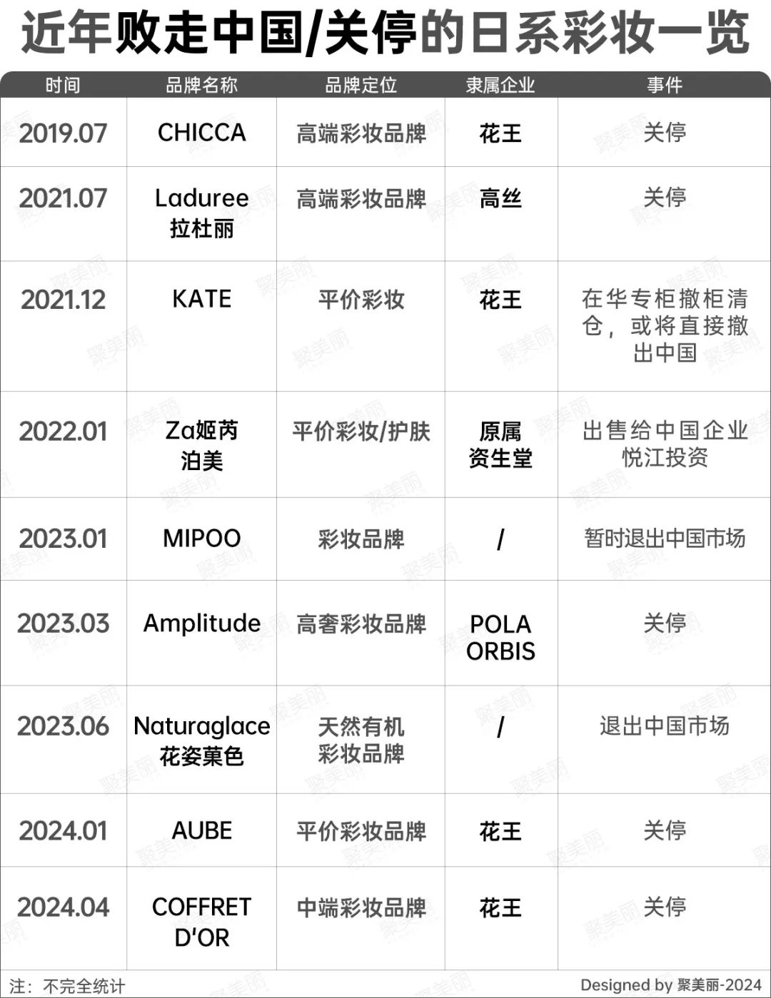 另一日妆巨头花王旗下的两大彩妆品牌AUBE和COFFRET D'OR也因市场声量下滑、业绩增长乏力而宣布“停运”。