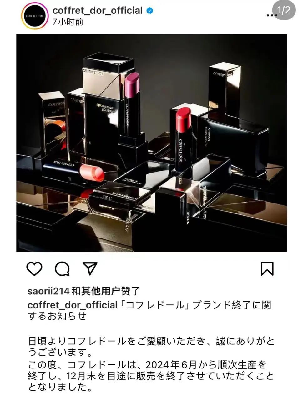 昨日(4月1日),花王旗下彩妆品牌COFFRET D'OR(中文名:金炫光灿,俗称咖啡豆)在官方Instagram账号称,从2024年6月始将依次停产,最终12月底会停止销售。