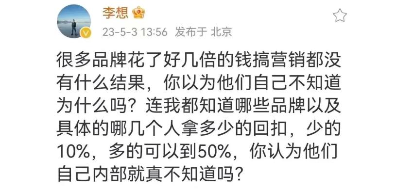 网友传某汽车自媒体一个月就从理想手里赚到30万元的宣传费,李想下场辟谣,说“这个粉丝量的自媒体是不会商业合作的”;还直接在微博里揭秘行业吃回扣......