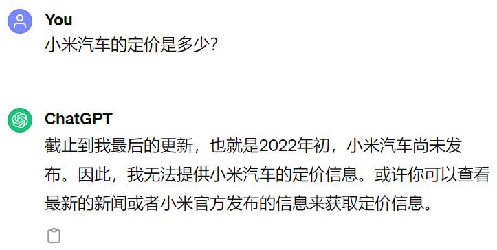对比之下,免登录版 ChatGPT ,一没联网,二没更新知识库,还停留在 2022 年 1 月。要查一些有时效性的信息时,它就是个摆设,世超随口问了句小米汽车的定价, ChatGPT 就没回答出来。