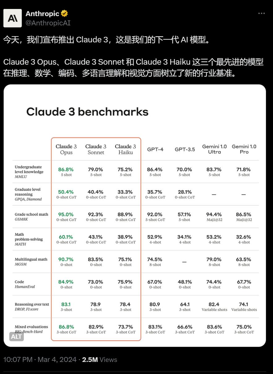 像是谷歌的 Gemini 刚出来的时候,都不屑跟 GPT-3.5 比,直接拉来了 GPT-4 。还有前不久刚出来的 Claude 3 ,免费的中杯模型,在所有能力的测试上全都超过了 GPT-3.5 ,有的都比 GPT-4 强了。