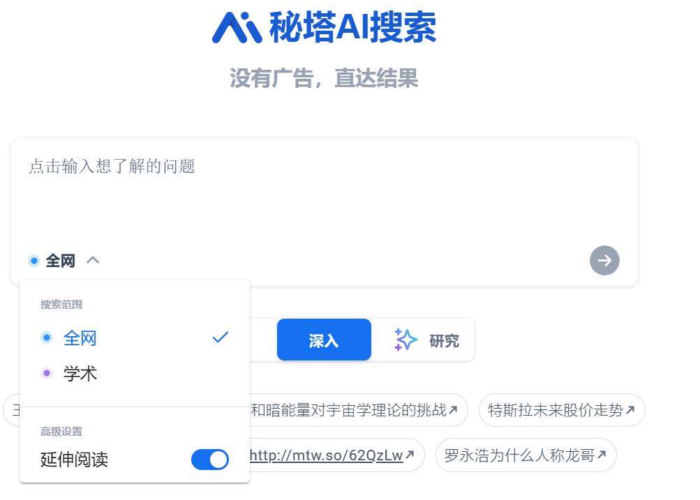 甚至有的产品都能自个儿设置模式了,提供简洁、深入、研究三种选择,还有联网和学术模式切换。